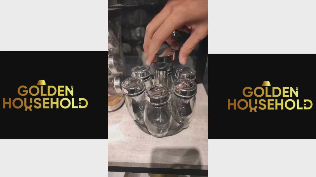 - Set Includes: 1 x Rotating Stand, 6 x Glass Spice Jars